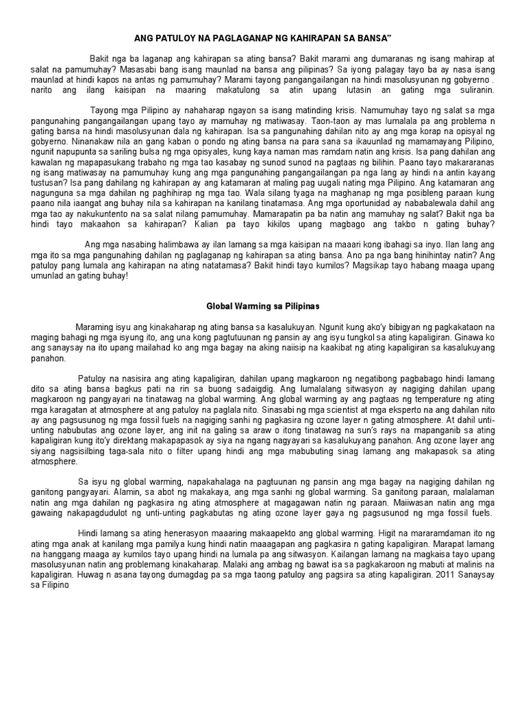 1 Hindi nga natin itinatakwil ang korapsyon sapagkat binabati pa natin. Ngunit masasabi rin nating paano naman ang mga mayayaman na patuloy pa ring nagnanakaw. Dahil sa madilim na kasaysayang naglugmok sa ating mga ninuno sa kahirapan na naging dahilan upang bumaba ang kanilang pagtingin sa sarili kung kayat nawalan na ng tiwala sa kanilang kakayahan naging madali para sa mga mayayaman ang pananamantala sa mahihirap tulad halimbawa ng pangangamkam ng mga lupain.