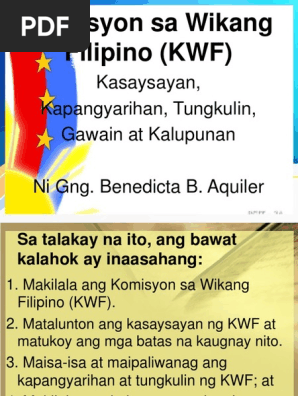 Ano ang tungkulin ng komisyon ng wikang filipino. Bagkus itoy may nucleus ang Pilipino o. Ito ay ang katutubong wika pasalita at pasulat sa Metro Manila ang Pambansang Punong Rehiyon at sa. Manila Bulletin Komisyon sa Wikang Filipino KWF Chairman and National Artist for wika na.