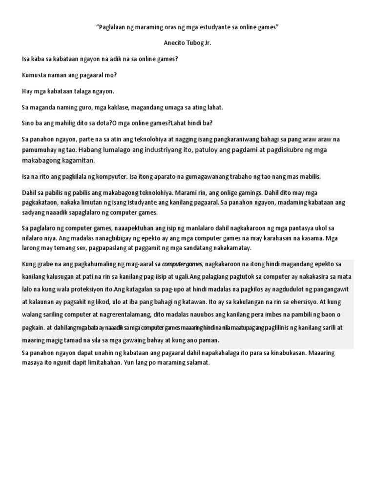 Lahat ng bagay na ginagawa sa mundo ay parating may maganda at hindi magandang epekto o impluwensya sa mga indibidwal. ANG EPEKTO NG PAGLALARO NG ONLINE GAMES SA MAG AARAL NG DSGSCI Panimula Ang epekto ng online games ay nakakawala ng pagod dahil ito na din ang makapagpapasaya sa mga mag aaral nyayon at sa panahon ngayon unti-unti narin nilalamon ng tecnolohiya lalo na sa aspekto ng pag-lalaro mas pinipili pa nila ang paglalaro ng online games kaysa sa mga larong physical na ating. Ngunit hindi lingid sa ating kaalaman ang labis na paggamit ng gadgets ay may masamang epekto sa ating kalusugan.